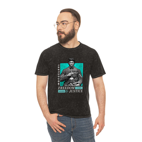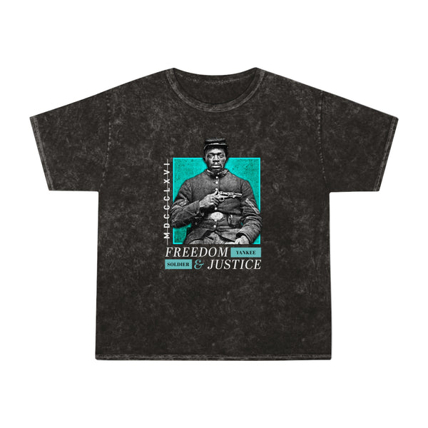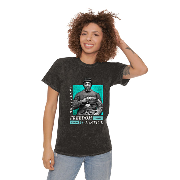 Celebrate courage and resilience with our Freedom & Justice T-shirt, featuring an African-American Yankee soldier against a vibrant color block backdrop. This tee honors the fight for freedom and justice.